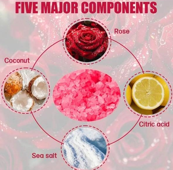 • گل رز (Rose): برای عطر دلنشین و خواص تسکیندهنده و آبرسانی. (در تصاویر آمده: "عصاره گل رز شما را سالمتر میکند" و "گذاشتن پا در آب حاوی این نمک، معادل یک اسپای آرامشبخش است").